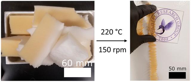 最后,研究人員將此方法應用于從消費品中提取的PU泡沫,并設想該方法可用于處理每年產生的大量PU廢料,研究人員購買了商用PU泡沫塑料,并使用DBTDL催化劑進行微混合和擠出處理。